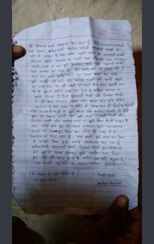 ఈ చిన్న సంఘటనపై ఆగ్రహించిన ముగ్గురు దళిత వ్యక్తులు మరో ఇద్దరు మహిళలతో సహా తనను జుట్టు పట్టి లాగి కొట్టారని మృతుడు లేఖలో ఆరోపించాడు. అంతటితో ఆగక ఆ ముగ్గురు నిందితులు వికాస్ తీసుకెళ్లిన పాత్రను తీసుకొని, మానవ మూత్రంతో నింపి, తాగమని బలవంతం చేశారు.