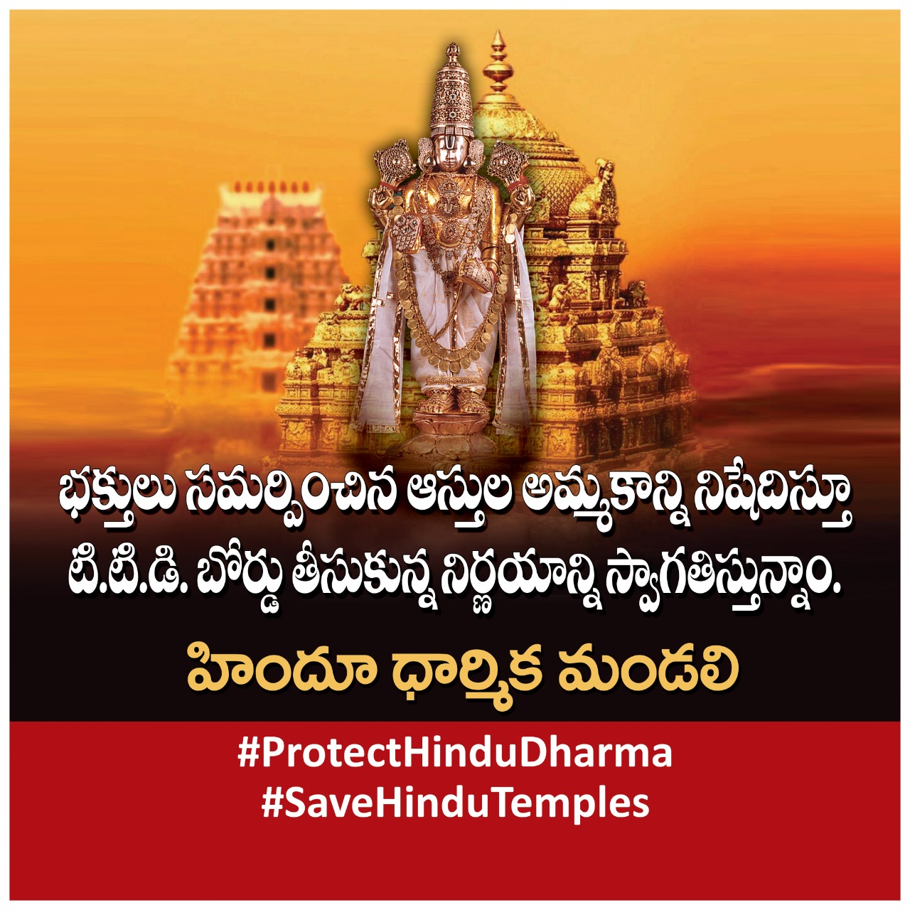 తిరుమల తిరుపతి దేవస్థానం పరిధిలోని భూముల మరియు ఇతర ఆస్తుల అమ్మకాలను నిషేధిస్తూ టీటీడీ బోర్డు తీసుకున్న నిర్ణయాన్ని తాము స్వాగతిస్తున్నామని, ఇదేవిధంగా రాష్ట్ర వ్యాప్తంగా ఉన్న అన్ని దేవాలయాల ఆస్తుల పరిరక్షణ కోసం దేవదాయ ధర్మదాయ శాఖ వారు తీర్మానం చేయాలని, ఎండోమెంట్ భూములను అమ్మకుండా, అన్యాక్రాంతం చేయకుండా రక్షించేలా రాష్ట్ర ప్రభుత్వం చట్టం చేయాలని కోరుతూ రాష్ట్రంలోని హిందువులందరూ 30 మే శనివారం సాయంత్రం గం.6.30 నుండి గం.7.30 వరకు ప్లకార్డుల ద్వారా తమ ఆకాంక్షను తెలుపుతూ, సరిగ్గా 7 గంటల సమయంలో ప్రతి ఇంటి ముందు 7 దీపాలు వెలిగించి 3 నిముషాల పాటు ఘంటానాదం చేయవలసిందిగా హిందూ ధార్మిక మండలి పిలుపునిచ్చింది. ఈ మేరకు వారు ఒక ప్రకటనను విడుదల చేశారు.