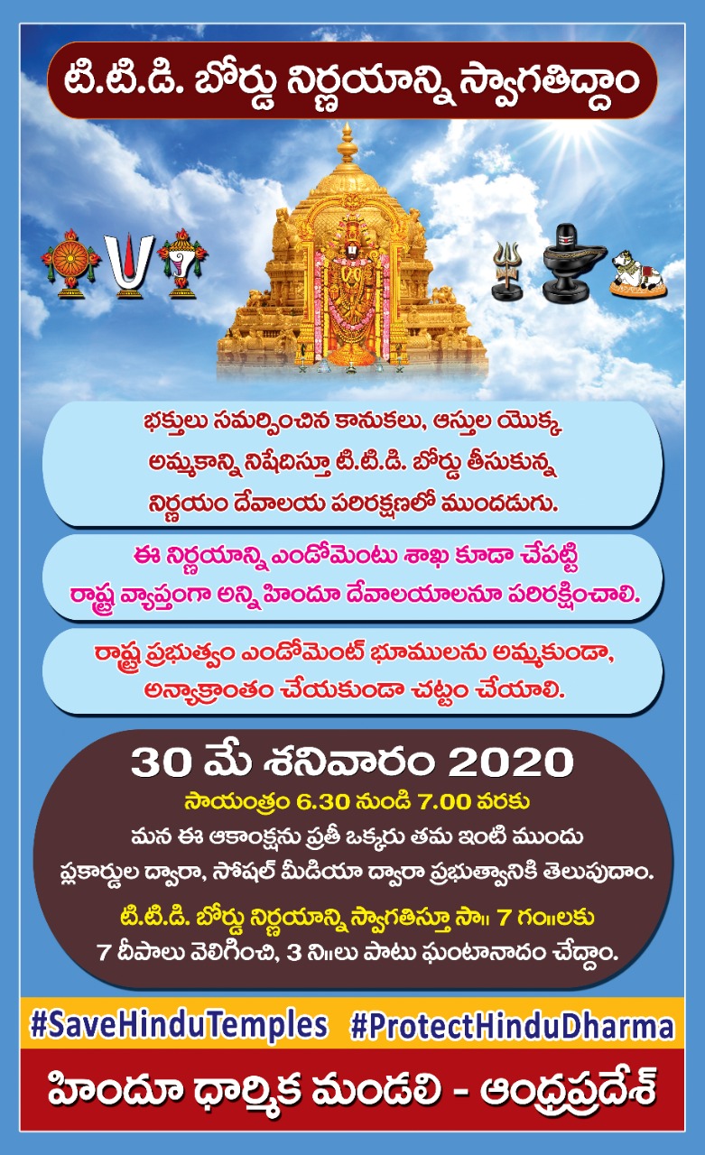టి.టి.డి బోర్డు నిర్ణయాన్ని స్వాగతిస్తూ 7 గంటలకు 7 దీపాలు వెలిగించి 3 నిమిషాలు ఘంటానాదాన్ని చేద్దాం. హిందూ దేవాలయ భూములను,ఆస్తులను పరిరక్షించుకునే సంకల్పాన్ని,శక్తిని ప్రతీ హిందువుకు, ప్రభుత్వానికి కలిగించవలసిందిగా ఏడుకొండల స్వామిని భక్తితో ప్రార్థిద్దాం.