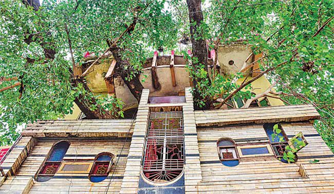 ఇది మధ్యప్రదేశ్లోని జబల్పుర్లో భారీ రావిచెట్టు చుట్టూ నిర్మించిన ఇల్లు. యోగేశ్ కేషర్వాణి అనే పర్యావరణవేత్త… తన తండ్రి నాటిన ఈ వృక్షాన్ని తొలగించడానికి ఇష్టపడక దీన్ని ఇలా నిర్మించారు. ఇప్పుడు ఆయన కూడా కాలం చేశారు. అయితేనేం! కుటుంబ సభ్యులు నిత్యం ఈ చెట్టును పూజిస్తూ, దానిని కంటికి రెప్పలా కాపాడుకుంటున్నారు. మేడపై దాని కొమ్మల కిందే సేదతీరుతున్నారు .