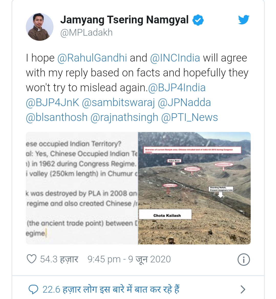 గత కొద్ది రోజులుగా భారత్-చైనా సరిహద్దుల్లో నెలకొన్న ఉద్రిక్తలు చర్చల ద్వారా పరిష్కరించుకునేందుకు ఇరు దేశాలకు చెందిన సైనిక ఉన్నతాధికారులు పలు దఫాలుగా సమావేశమయ్యారు. ఈ నేపథ్యంలో లడ్డాఖ్లోని భారత్ భూభాగాన్ని చైనా ఆక్రమించిందా అని కాంగ్రెస్ నాయకుడు రాహుల్ గాంధీ, రక్షణ మంత్రి రాజ్నాథ్ సింగ్ను సామాజిక మాధ్యమాల వేదికగా ప్రశ్నించారు. రాహుల్ ట్వీట్పై లడ్డాఖ్ ఎంపీ జమ్యాంగ్ సెరింగ్ నంగ్యాల్ స్పందించారు. కాంగ్రెస్ హయాంలోనే చైనా భారత్ భూభాగాన్ని ఆక్రమించుకుందని, ఇందుకు తగిన ఆధారాలు అంటూ పలు సందర్భాల్లో చైనా ఆక్రమించిన ప్రదేశాలను సూచిస్తూ ఫొటో, దానికి సంబంధించిన వివరాలను షేర్ చేశారు.