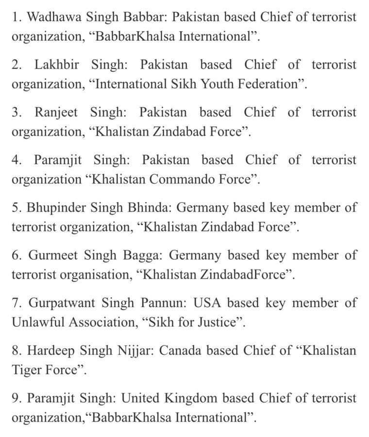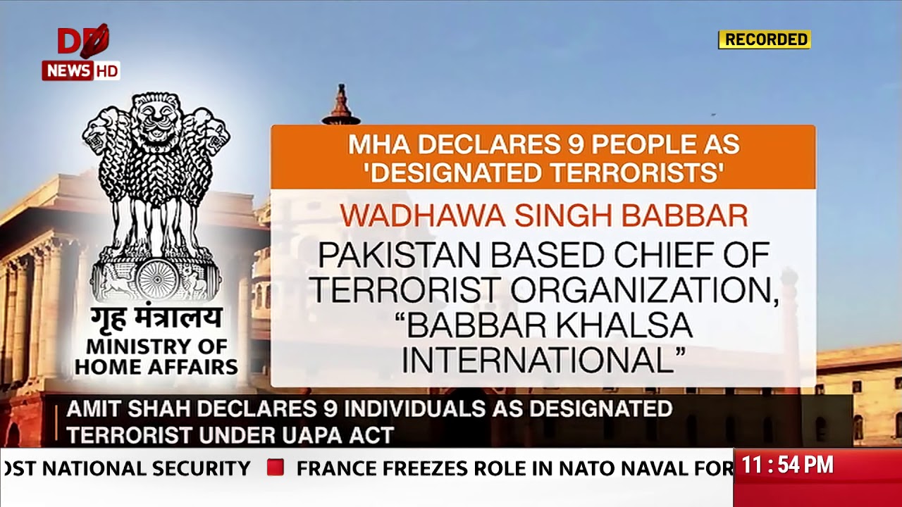 కేంద్ర హోం మంత్రిత్వ శాఖ యుఎపిఎ చట్టం నిబంధనల ప్రకారం తొమ్మిది మంది వ్యక్తులను నియమించబడిన ఉగ్రవాదులుగా ప్రకటించింది. ఈ వ్యక్తులు సరిహద్దు పొడవునా విదేశీ గడ్డపై నుండి వివిధ ఉగ్రవాద చర్యలకు పాల్పడుతున్నారని కూడా కేంద్ర హోం మంత్రిత్వ శాఖ ప్రకటించింది.