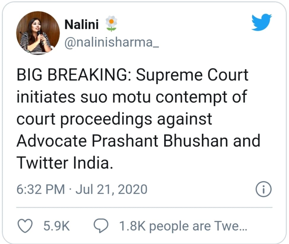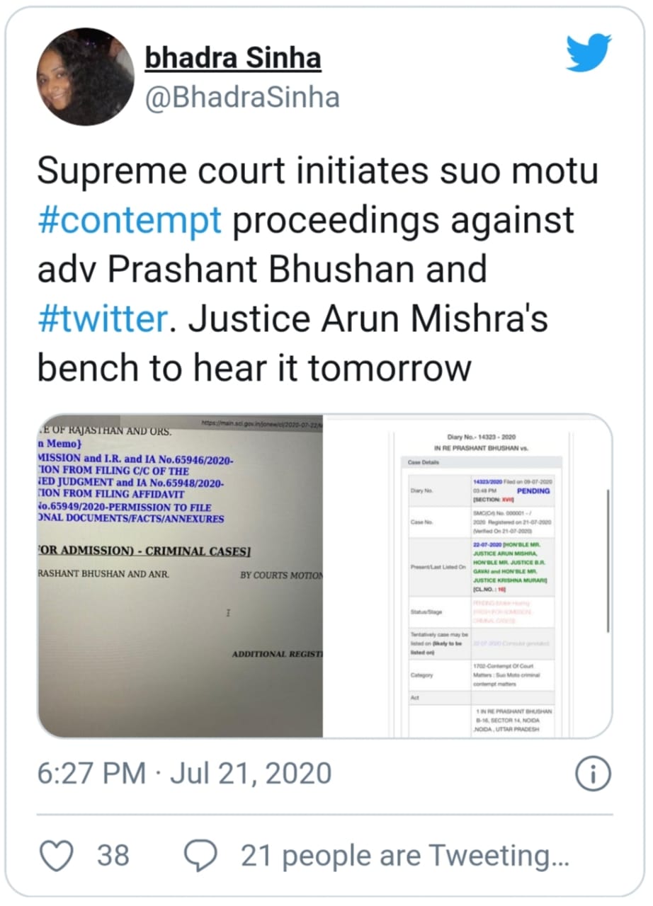 హక్కుల కార్యకర్త ప్రశాంత్ భూషణ్, ట్విట్టర్ ఇండియాలపై కోర్టు ధిక్కారం కేసును సుప్రీంకోర్టు సుమోటోగా స్వీకరించింది. జస్టిస్ అరుణ్ మిశ్రా బెంచ్ బుధవారం దీనిని విచారించనుంది.