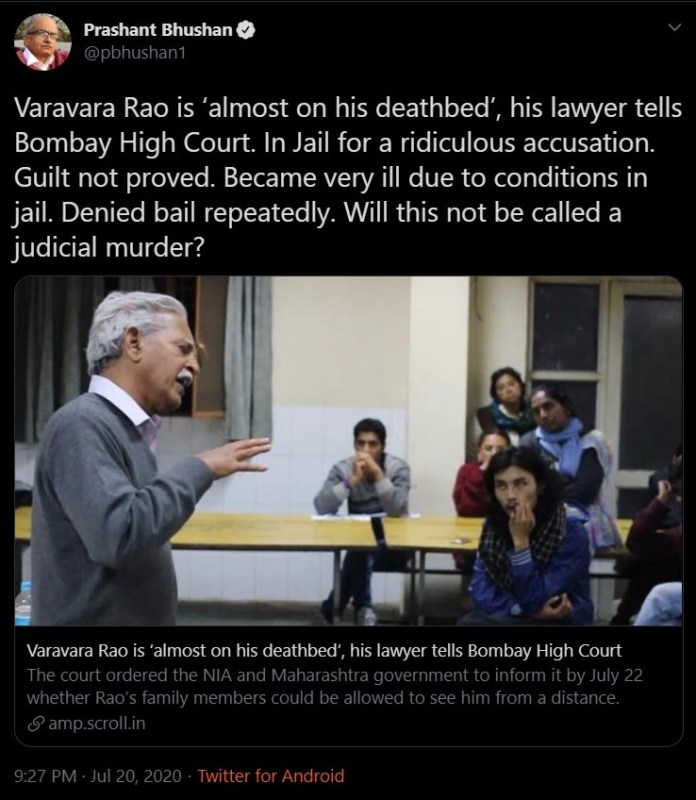 హక్కుల కార్యకర్త, ప్రముఖ న్యాయవాది ప్రశాంత్ భూషణ్ ప్రస్తుత కోర్టు చర్యలను ధిక్కరించడానికి గల కారణం స్పష్టంగా తెలియకపోయినా, ప్రశాంత్ భూషణ్ ‘అర్బన్ నక్సల్’ వరవరరావుపై ట్వీట్ చేయడం వల్ల ఇబ్బందుల్లో పడ్డారని తెలుస్తోంది. ఎల్గర్ పరిషత్ కేసులో నిందితుడైన వరవరరావుకు అనేక సందర్భాల్లో సుప్రీంకోర్టు బెయిల్ నిరాకరించినట్లు ప్రశాంత్ భూషణ్ ట్వీట్లో పేర్కొన్నారు. ఒకవేళ వరవరరావు మరణిస్తే అది ‘జ్యుడిషియల్ హత్య’ అవుతుందని ప్రశాంత్ భూషణ్ ట్వీట్ లో పేర్కొన్నారు. కోర్టు ఆగ్రహానికి ఇదే కారణంగా కనిపిస్తోంది.