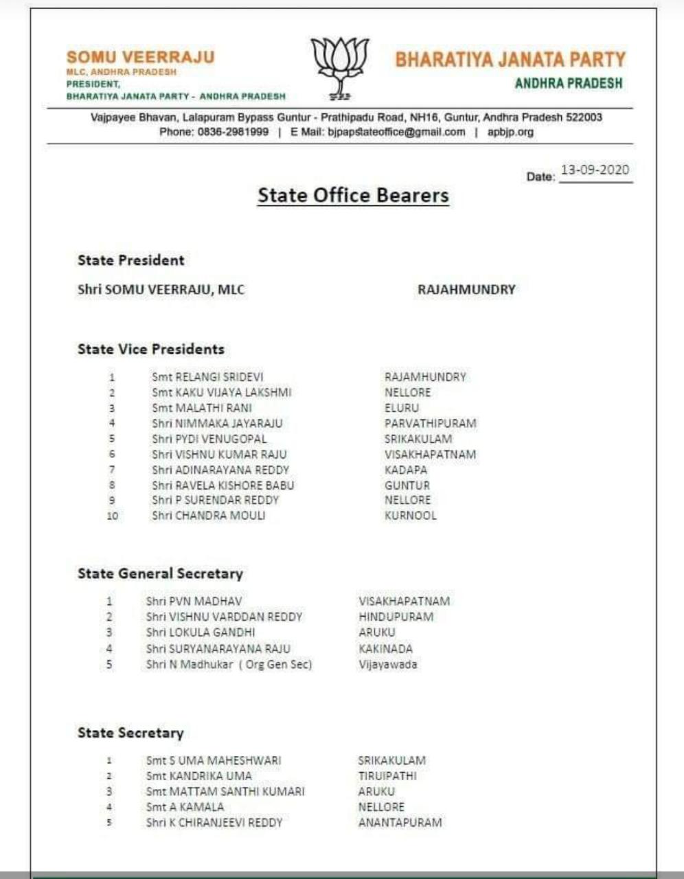ఏపీ భాజపా పదాధికారులను రాష్ట్ర అధ్యక్షుడు సోము వీర్రాజు నియమించారు. ఉపాధ్యక్షులు, ప్రధాన కార్యదర్శులు, కార్యదర్శులు, అధికార ప్రతినిధులు, వివిధ విభాగాలను అధ్యక్షుల వివరాలను ఏపీ భాజపా ప్రకటించింది. ఈ మేరకు ప్రకటన విడుదల చేసింది. ఉపాధ్యక్షులుగా 10 మంది, ప్రధాన కార్యదర్శులు 5, కార్యదర్శులు 5, అధికార ప్రతినిధులుగా ఆరుగురిని నియమించారు.