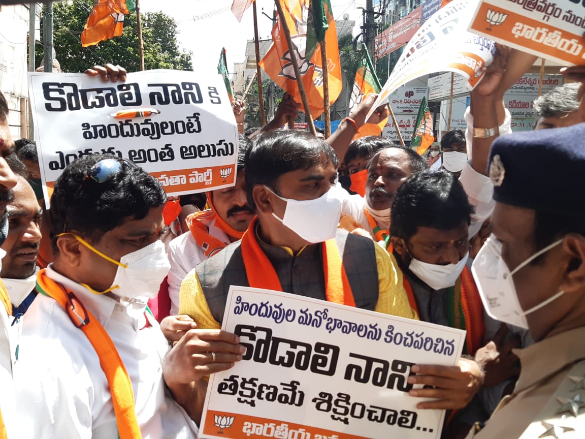 BJP leader Vishnuvarthan Reddy in Vijayawada, Bhanuprakash Reddy in Tirupati and former minister Adinarayana Reddy in Kadapa participated in the dharna. Kodali Nani was incensed that he had insulted the Hindu community. BJP leaders placed under house arrest by police in Gudivada