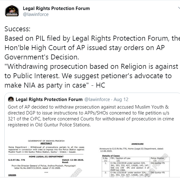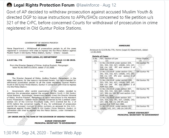 2018లో పాత గుంటూరు పోలీసు స్టేషనుపై ముస్లిం యువత దాడి జరిపిన సంఘటన విదితమే. ఆ దాడిలో పాత్రులైన వారిపై పోలీసులు ఎఫ్ఐఆర్లు నమోదు చేయగా, డిజిపి 17.02.20వ తేదీన సదరు కేసులపై ప్రాసిక్యూషన్ ఉపసంహరించుకుంటూ ప్రభుత్వానికి లేఖ వ్రాశారు. సదరు లేఖని ఆమోదిస్తూ ప్రభుత్వం 12.08.2020వ తేదీన జి.ఒ. ఆర్.టి 776 విడుదల చేస్తూ ప్రాసిక్యూషన్ ఉపసంహరించుకొవాలని స్టేషన్ హౌస్ ఆఫీసర్ మరియు పబ్లిక్ ప్రాసిక్యూటర్లకు ఆదేశాలు జారీచేసింది. ఈ అంశంపై తాజాగా Legal Rights Protection Forum హైకోర్టులో ప్రజా ప్రయోజన వ్యాజ్యం పిటీషన్ వేసింది.