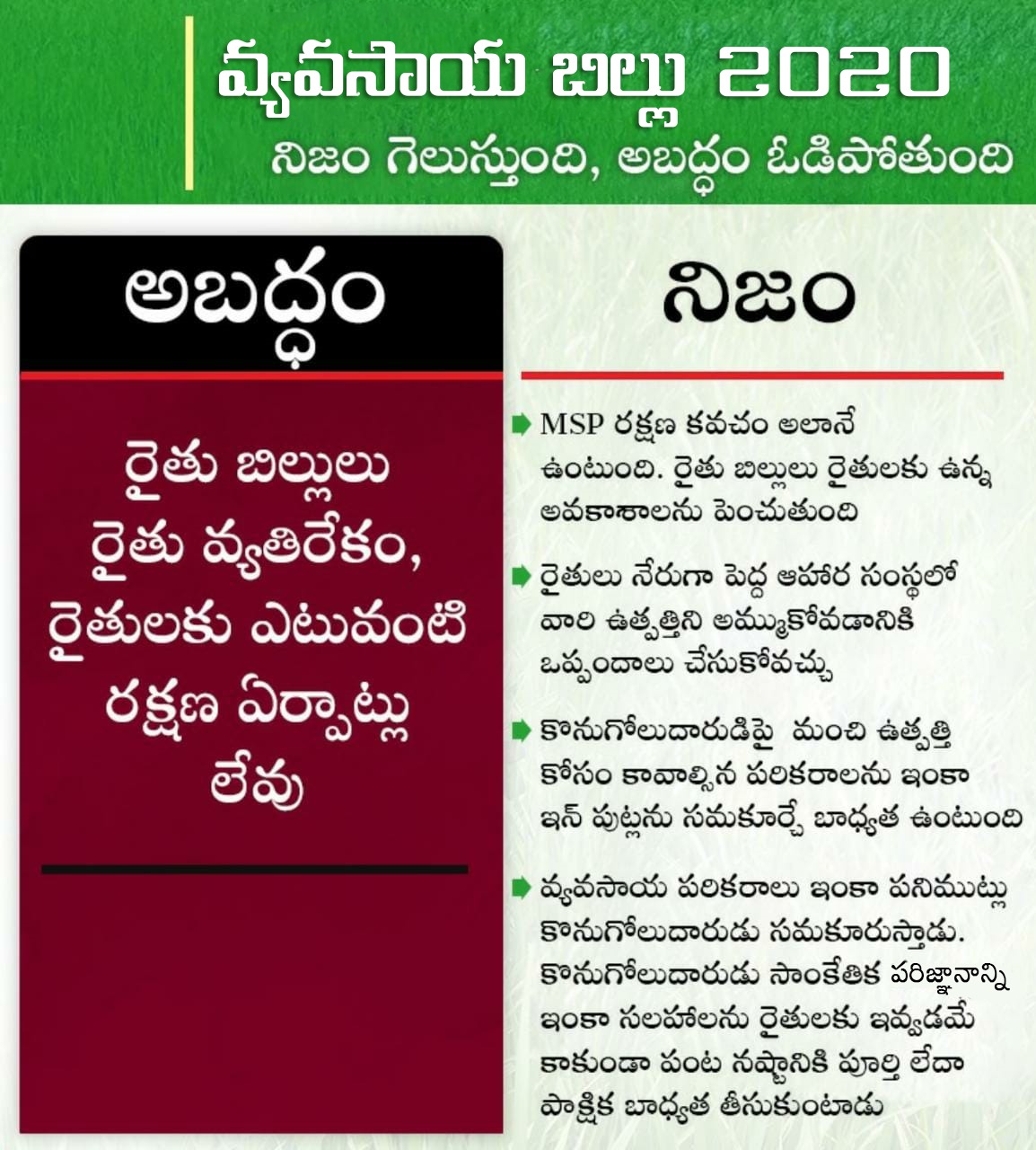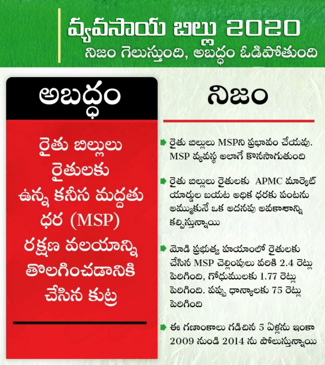 చట్టంలో MSP (కనీస మద్దతు ధర) ని గురించి ప్రస్తావించడమే కాకుండా, ప్రధాని తన అనేక ప్రసంగాల్లో కనీస మద్ధతు ధరను తీసివేయబోమని చెప్పారు. రైతుల వద్ద కొన్న ధాన్యానికి కనీస మద్దతు ధర ప్రకారం 3 రోజుల్లో చెల్లింపులు చేయబడతాయని చాలా సార్లు చెప్పారు. ఈ విషయాన్ని ప్రస్తావించకుండా కనీస మద్దతు ధరని ప్రభుత్వం తీసి వేస్తుంది అనడం నకిలీ కథనమే అవుతోంది. రైతులు తమ ఉత్పత్తిని ఎక్కడైనా అమ్ముకోవచ్చు, మండీలలోనే అమ్మాలనే నిబంధనలేదు. రైతుకు ఎక్కడా మద్దతు ధర రాకపోతే ప్రభుత్వమే కనీస మద్దతు ధర ఇచ్చి ఉత్పత్తులను కొంటుంది. ఇప్పటి వరకు రైతులు మండీలనే చట్రంలో బిగించబడి దళారుల దోపిడీకి గురై తాము పండించిన పంటకు సరైన ధర రాక నష్టపోతూ ఆత్మహత్యలకు పాల్పడిన ఘటనలు చాలానే ఉన్నాయి.