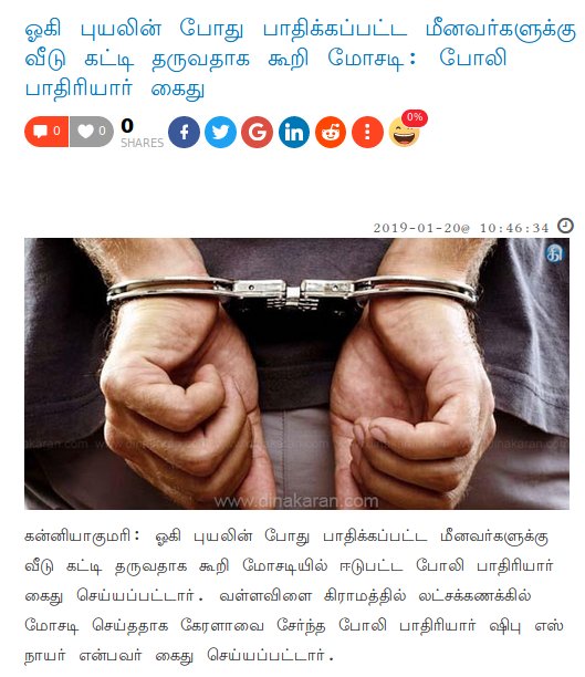 అలాగే మరో వ్యక్తి, కేరళకు చెందిన షిబు నాయర్, ఒక పాస్టర్ వలె నటించి, 2017 లో ఓఖీ తుఫాను సమయంలో ప్రభావితమైన మత్స్యకారుల కోసం ఇళ్ళు నిర్మిస్తానని చెప్పి ప్రజల నుండి డబ్బు వసూలు చేశాడు. అలాగే అనాథాశ్రమాన్ని కూడా నిర్మిస్తానాని చెప్పి లక్షలాది రూపాయల డబ్బు వసూలు చేశాడు.