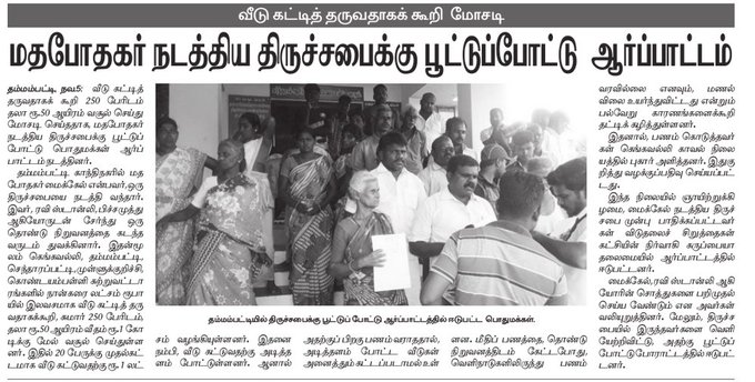 స్థానిక దళిత పార్టీ VCK నేతృత్వంలో బాధిత ప్రజలు నిరసన వ్యక్తం చేశారు. అతని ఆధ్వర్యంలో నడిచే అపోస్టలిక్ గాస్పెల్ మిషన్ చర్చికి తాళం వేశారు. అనంతరం అఖిల భారత మైనారిటీ ఫోరం నిర్వహించిన శాంతి సమావేశం గందరగోళం నెలకొనడంతో సదరు పాస్టరు, అతని సహచరులు పరారీలో ఉన్నారు.