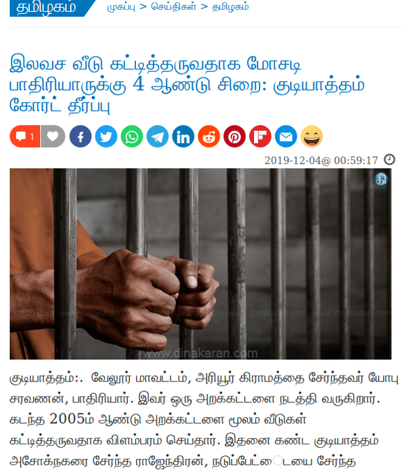 తమిళనాడులోని వెల్లూరులో ఒక పాస్టర్ పిల్లల చదువుల నిమిత్తం స్కాలర్షిప్ లు ఇప్పిస్తానని చెప్పి అనేకమంది రోజువారీ కూలీలను మోసం చేశాడు. రోజువారీ కూలీ కుమార్ కు, తన ఇద్దరు పాఠశాలకు వెళ్ళే పిల్లల విద్య కోసం ఆర్థిక సహాయం అవసరమైంది. అతను తన పిల్లలకు స్కాలర్షిప్ అందించగల ట్రస్ట్ గురించి విన్నాడు. దాంతో అతను ఆ ట్రస్ట్ నడుపుతున్న విక్టర్ జేసుదాస్ ను సంప్రదించాడు. కుమార్ పిల్లలకు స్కాలర్షిప్ ఏర్పాటు చేస్తానని విక్టర్ వాగ్దానం చేశాడు. అయితే దీనికి ₹ 20,000 ఖర్చవుతుందని చెప్పాడు. అందుకు సమ్మతించిన కుమార్ ఆ డబ్బు సమకూర్చి ఇచ్చాడు. అలాగే మరికొందరు రోజువారీ కూలీలను కూడా విక్టర్ దగ్గరకు తీసుకువచ్చాడు.