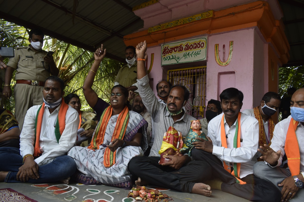 ఈ ఘటనపై హిందూ సంఘాలు తీవ్ర ఆగ్రహాన్ని వ్యక్తం చేశాయి. ప్రభుత్వ ఉదాసీనత వల్లే ఇలాంటి సంఘటనలు రాష్ట్రంలో పదే పదే చోటుచేసుకుంటున్నాయని వారు ఆరోపిస్తున్నారు. సంఘటన గురించి తెలిసిన వెంటనే విశ్వహిందూ పరిషత్, బజరంగ్ దళ్ కార్యకర్తలు హుటాహుటిన ఘటనాస్థలిని చేరుకున్నారు. పెద్ద సంఖ్యలో అక్కడకు చేరిన విశ్వహిందూ పరిషత్ కార్యకర్తలు హిందూ దేవీదేవతల విగ్రహాల ధ్వంసంపై ప్రభుత్వ నిర్లక్ష్య వైఖరి నశించాలంటూ పెద్దపెట్టున నినాదాలు చేశారు. విషయం తెలుసుకుని అక్కడికి చేరుకున్న పోలీసులు నిరసనకారులకు నచ్చజెప్పే ప్రయత్నం చేశారు. అయినా నిరసనకారులు తమ నిరసనను మధ్యాహ్నం వరకూ కొనసాగించారు. జరిగిన, జరుగుతున్న ఘటనలకు కారకులైన వారిని గుర్తించి వారిని కఠినంగా శిక్షించాలని హిందూ సంఘాలు డిమాండ్ చేస్తున్నాయి.