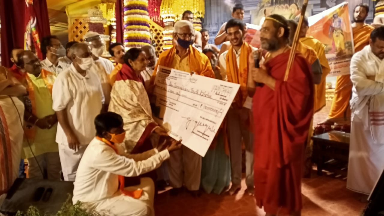 మాజీ బీజేపీ ఎంపీ శ్రీ గోకరాజు గంగరాజు గారి సతీమణి శ్రీమతి లైలా కుమారి, వారి కుమారుడు గోకరాజు గంగరాజు, వారి మనమడు ఆదిత్య వర్మలు శ్రీ రామజన్మభూమి నిర్మాణ నిధికి కోటి రూపాయల చెక్కునందిస్తున్న దృశ్యం.  కార్యక్రమంలో ఆరెస్సెస్ ఆంధ్ర ప్రాంత ప్రచారక్ శ్రీ భరత్ జీ మరియు ఇతర కార్యకర్తలను కూడా చిత్రంలో చూడొచ్చు .