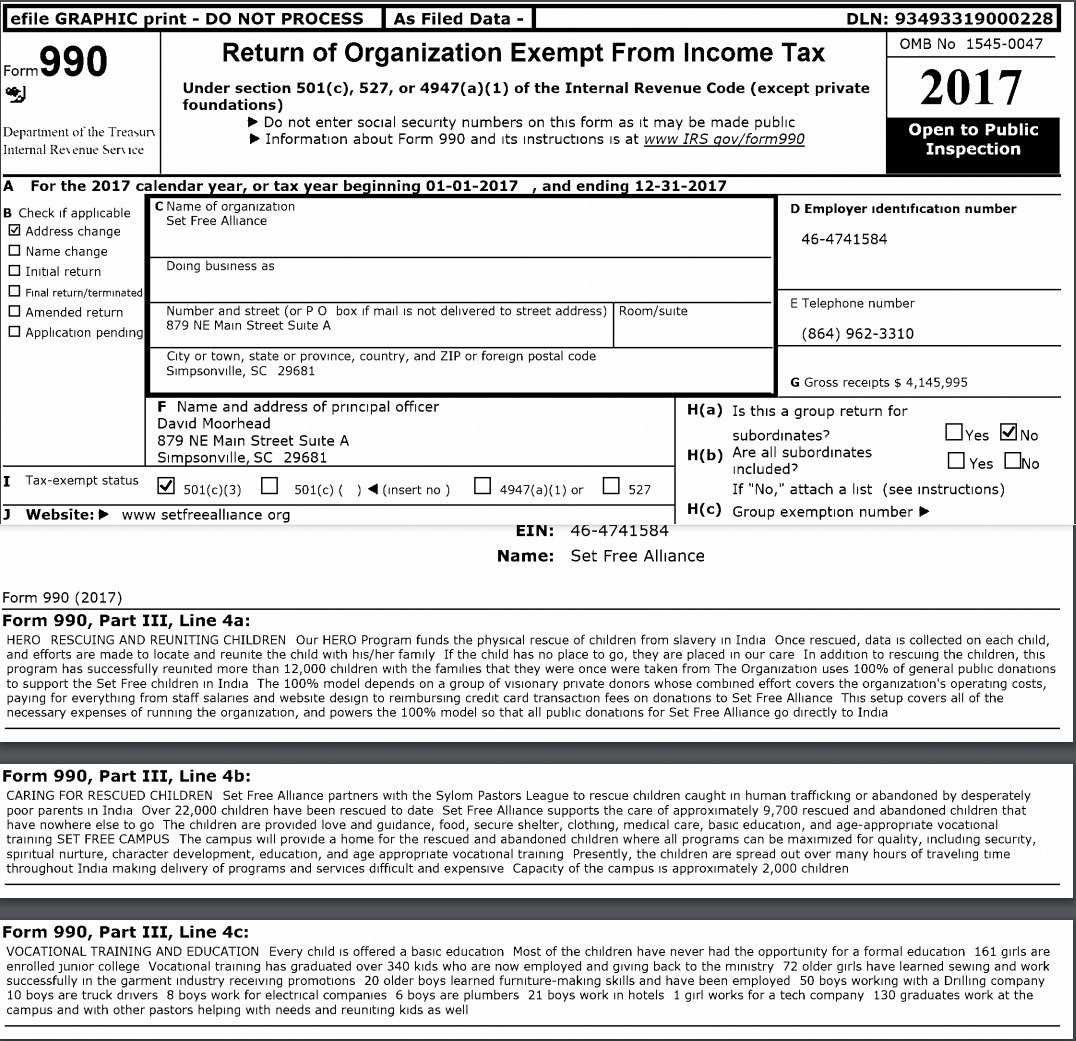 వీరికి నిధులిచ్చిన అమెరికా సంస్థలు Set Free Alliance మరియు Water of Life తమ అమెరికన్ ప్రభుత్వానికి సమర్పించిన ఐటీ రిటర్న్లలో మాత్రం 2017 నాటికి 22,000 మంది బానిస బాల కార్మికులను రక్షించినట్టు స్పష్టంగా తెలియజేసింది.