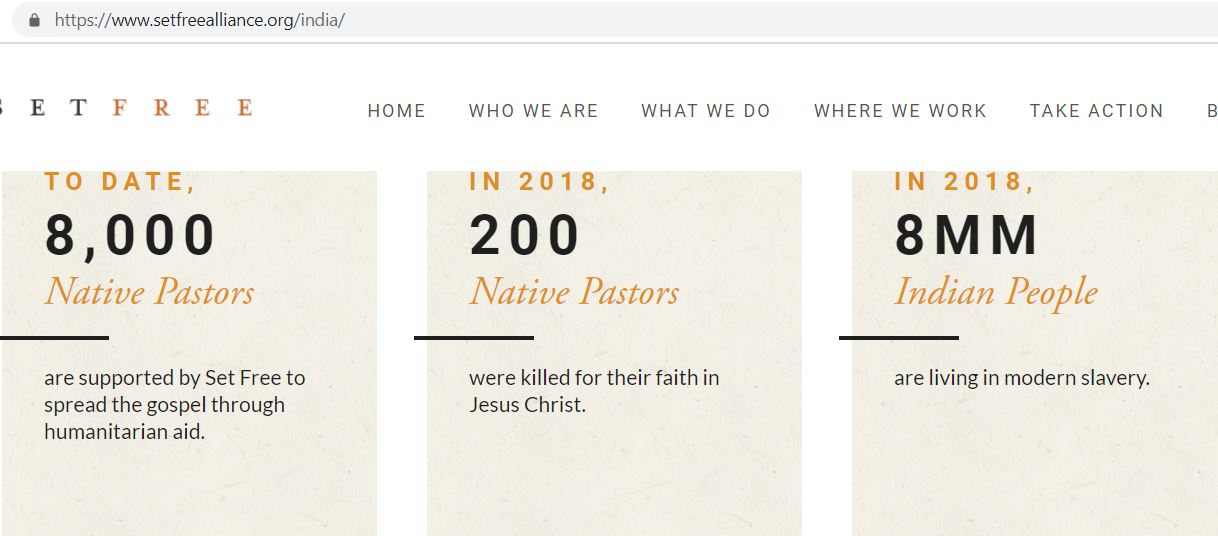 ఇక ప్రవీణ్ చక్రవర్తికి చెందిన ‘సైలోమ్ బ్లైండ్ సెంటర్’ విదేశీ నిధుల కోసం భారతదేశ పరువును సైతం ఫణంగా పెట్టి తమకు నిధులు అందిస్తున్న సెట్ ఫ్రీ అలయన్స్ కు భారతదేశం విషయంలో తప్పుడు గణాంకాలు అందించింది. దీంతో ఇవే తప్పుడు గణాంకాలను ‘సెట్ ఫ్రీ అలయన్స్’ తమ అధికారిక వెబ్సైట్ లో ప్రదర్శనకు ఉంచి, భారతదేశంపై దుష్ప్రచారానికి తెరదీసింది. ఈ వెబ్సైట్ ఇస్తున్న తప్పుడు గణాంకాల ప్రకారం భారత్ ప్రపంచంలోనే అత్యధిక బానిసలున్న దేశం. అంతేకాకుండా ఆ బానిసల్లో ఎక్కువ శాతం 7నుండి 14 ఏళ్ల వయసున్న మైనర్ బాలబాలికలు!!