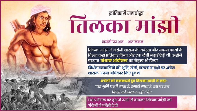 అటువంటి ప్రాంతంలో విరోచిత పోరాటం చేసిన వాళ్లలో తిలకా మాఝి ప్రథముడు, ప్రముఖుడు. ఝార్ఖండ్ లో సంతాల్ ఉద్యమంగా పేరొందిన తిరుగుబాటుకు నాయకత్వం వహించిన ఈ గిరిపుత్రుడిని తొలి స్వాతంత్ర్య సమరయోధుడిగా గుర్తిస్తారు. వలసపాలకుల అరాచకాలకు స్పందించి తిరుగుబాటు చేసి తన ప్రాణాలు కోల్పోయిన అమరవీరుడు తిలకా మాఝి.