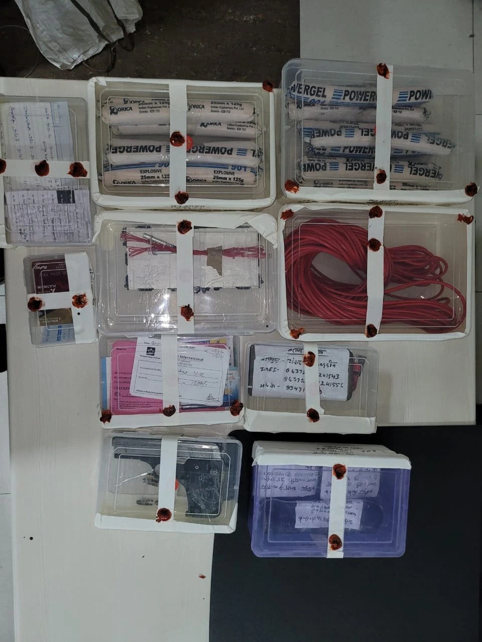 వారి వద్ద నుంచి భారీ పేలుడు పదార్థాలు, మందుగుండు సామాగ్రి, 32 బోర్ పిస్టల్స్, ఏడు రౌండ్ల బుల్లెట్లు, నాలుగు ఎటిఎం కార్డులు, పాన్ కార్డులు, నగదు, పెన్ డ్రైవ్, మెట్రో కార్డు, ఇతర వస్తువులను పోలీసులు స్వాధీనం చేసుకున్నారు. స్వాధీనం చేసుకున్న మందుగుండు సామాగ్రి, ఇతర వస్తువులను విలేఖరుల ముందు ప్రదర్శించారు. అరెస్టయిన ఉగ్రవాదులు కేరళ కి చెందిన అన్సాద్ బదిరుద్దీన్, ఫిరోజ్ ఖాన్ అని, వారు కేరళలోని పతన మిట్ట, కోజికోడ్ చెందిన వారని పోలీసులు పేర్కొన్నారు.