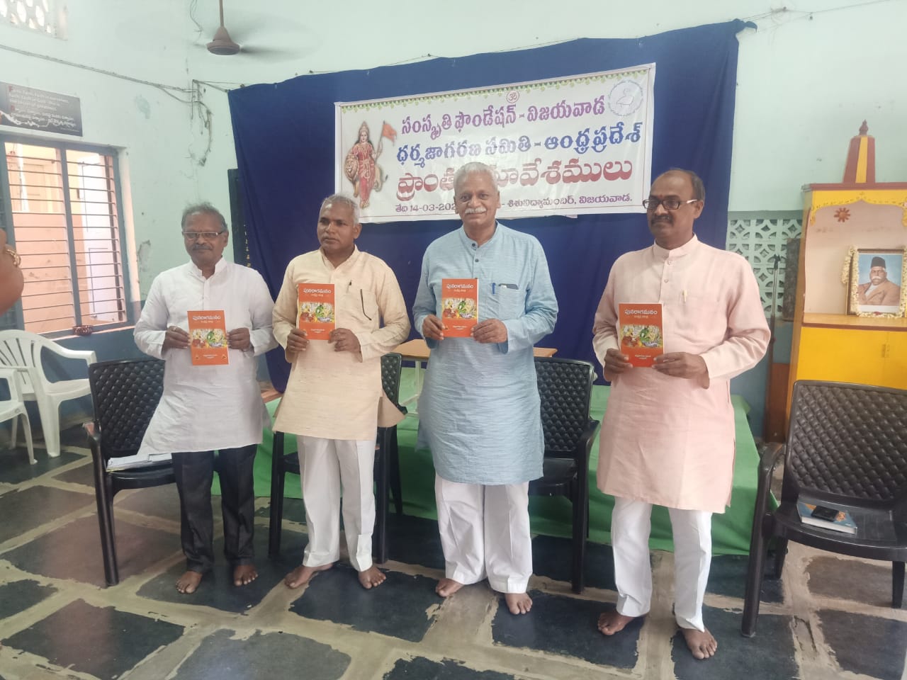 The book launch event, “Punaragamanam – Sankshiptha Charitra”(Telugu) printed by Dharma Jagarana Samiti, Andhra Pradesh was held at Shishu Vidya Mandir in Vijayawada. The book was inaugurated by Shri Ale Shyam Kumar, Akhila Bharatiya Saha Dharma Jagarana Pramukh at Dharma Jagarana Samiti Pranta (Andhra Pradesh State) meeting held on Sunday 14/3/2021 at Shishu Vidya Mandir in Vijayawada. This book is Written in Hindi by Dr.Sriranga Godbole and translated into Telugu by Sri Subrahmanyam (Mani). The book is published by Sahityaniketan Publishing House in Vijayawada. Speaking on this occasion, Sri Sham Kumar said,