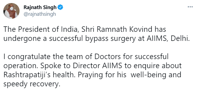”ఢిల్లీలోని ఎయిమ్స్లో రాష్ట్రపతి రామ్నాథ్ కోవింద్కు విజయవంతంగా బైపాస్ సర్జరీ నిర్వహించిన వైద్యులను అభినందిస్తున్నా. ఆయన ఆరోగ్య పరిస్థితిపై ఎయిమ్స్ డైరెక్టర్తో మాట్లాడాను. రాష్ట్రపతి త్వరగా కోలుకోవాలని ప్రార్థిస్తున్నా” అని రాజ్నాథ్ ట్వీట్ చేశారు.
