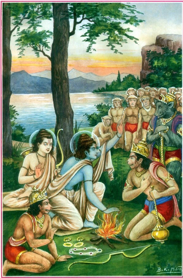 “ఓ రామా, నీవు నాకు స్నేహితుడవు. నా హృదయానికి ఎంతో ప్రియమైన వాడవు. మన దుఃఖసుఖాలు ఒక్కటే” అన్నాడు సుగ్రీవుడు. వారిద్దరూ అగ్నిసాక్షిగా మిత్రులైనారు. ఒకరి పట్ల మరొకరు వారిరువురి మనస్సులూ చాల ప్రీతిని పొందాయట. ఒకరినొకరు ఎంతగా చూసుకుంటున్నా తనివి తీరలేదట.