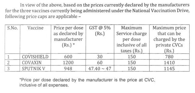 ప్రైవేటు ఆస్పత్రుల్లో అందించే కరోనా వ్యాక్సిన్ల ధరలను కేంద్ర ప్రభుత్వం నిర్ణయించింది. తాజాగా నిర్దేశించిన ధరల ప్రకారం.. కొవిషీల్డ్ వ్యాక్సిన్ ధర గరిష్ఠంగా ₹780లుగా ఉండగా.. భారత్ బయోటెక్ అభివృద్ధి చేసిన కొవాగ్జిన్ టీకా ₹1410, రష్యాకు చెందిన స్పుత్నిక్-వి ₹1145గా ఉండనుంది. అన్ని పన్నులతో పాటు ఆస్పత్రులకు రూ.150 సర్వీస్ ఛార్జి కూడా ఇందులో భాగమేనని కేంద్రం స్పష్టంచేసింది. అధిక ఛార్జీలు వసూలు చేసే ప్రైవేటు ఆస్పత్రులపై కఠిన చర్యలు తీసుకోవాలని రాష్ట్ర ప్రభుత్వాలను ఆదేశించింది.