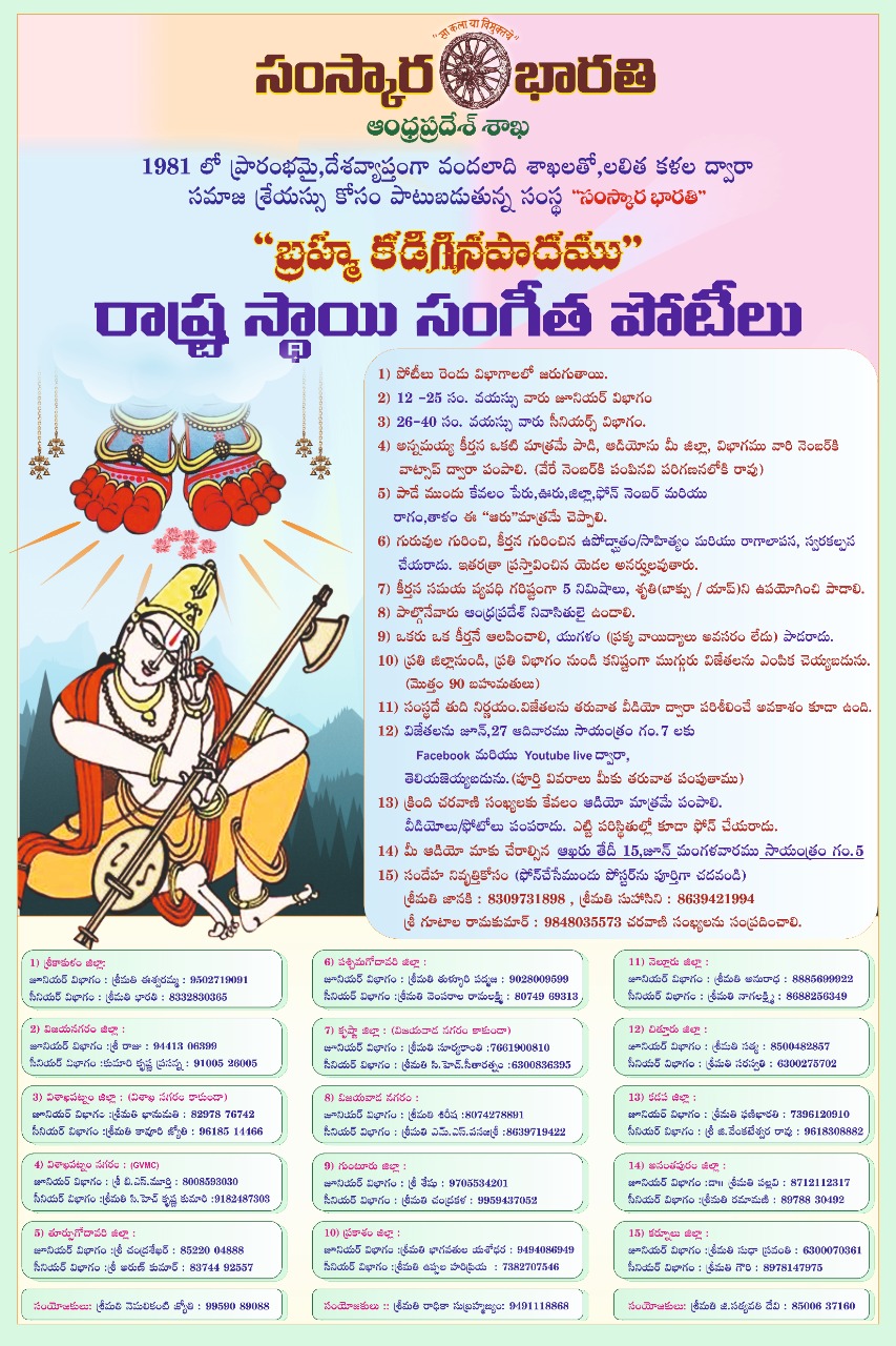 సంస్కార భారతి, ఆంధ్ర ప్రదేశ్ వారి ఆధ్వర్యంలో “బ్రహ్మ కడిగిన పాదము” పేరుతో రాష్ట్ర స్థాయి సంగీత పోటీలు నిర్వహింపబడుతున్నాయి.