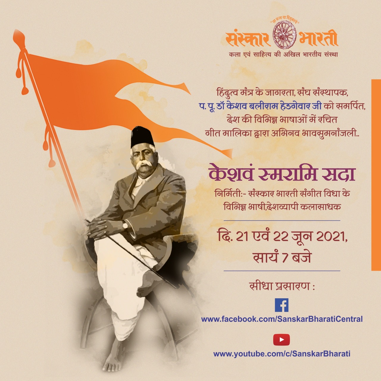 రాష్ట్రీయ స్వయంసేవక సంఘ నిర్మాత పరమ పూజనీయ డాక్టర్ కేశవరావు బలీరాం హెడ్గేవార్ పరమపదించిన రోజు జూన్ 21, 1940. ఆ సందర్భాన్ని పురస్కరించుకొని భారతదేశం మొత్తం నుంచి, అన్ని భాషలలో డాక్టర్ జీ జీవితంపై వ్రాయబడిన పాటలను వివిధ ప్రాంతాల సంస్కార భారతి కళాకారులు పాడడం జరిగినది. జూన్ 21వ తేదీ మరియు జూన్ 22వ తేదీ రెండు రోజులపాటు సాయంకాలం ఏడు గంటలకు సంస్కార భారతి ఫేస్బుక్ లైవ్ మరియు యూట్యూబ్ ద్వారా ఈ పాటల వీడియోలు ప్రసారం చేయడం జరుగుతున్నది. ఈ ప్రత్యక్ష ప్రసారాన్ని అందరూ తిలకించవలసిందిగా సంస్కార భారతి ఆంధ్రప్రదేశ్ శాఖ అందరికీ విజ్ఞప్తి చేస్తుంది. దీనికి సంబంధించిన లింకులను జత చేయడం జరుగుతున్నది .