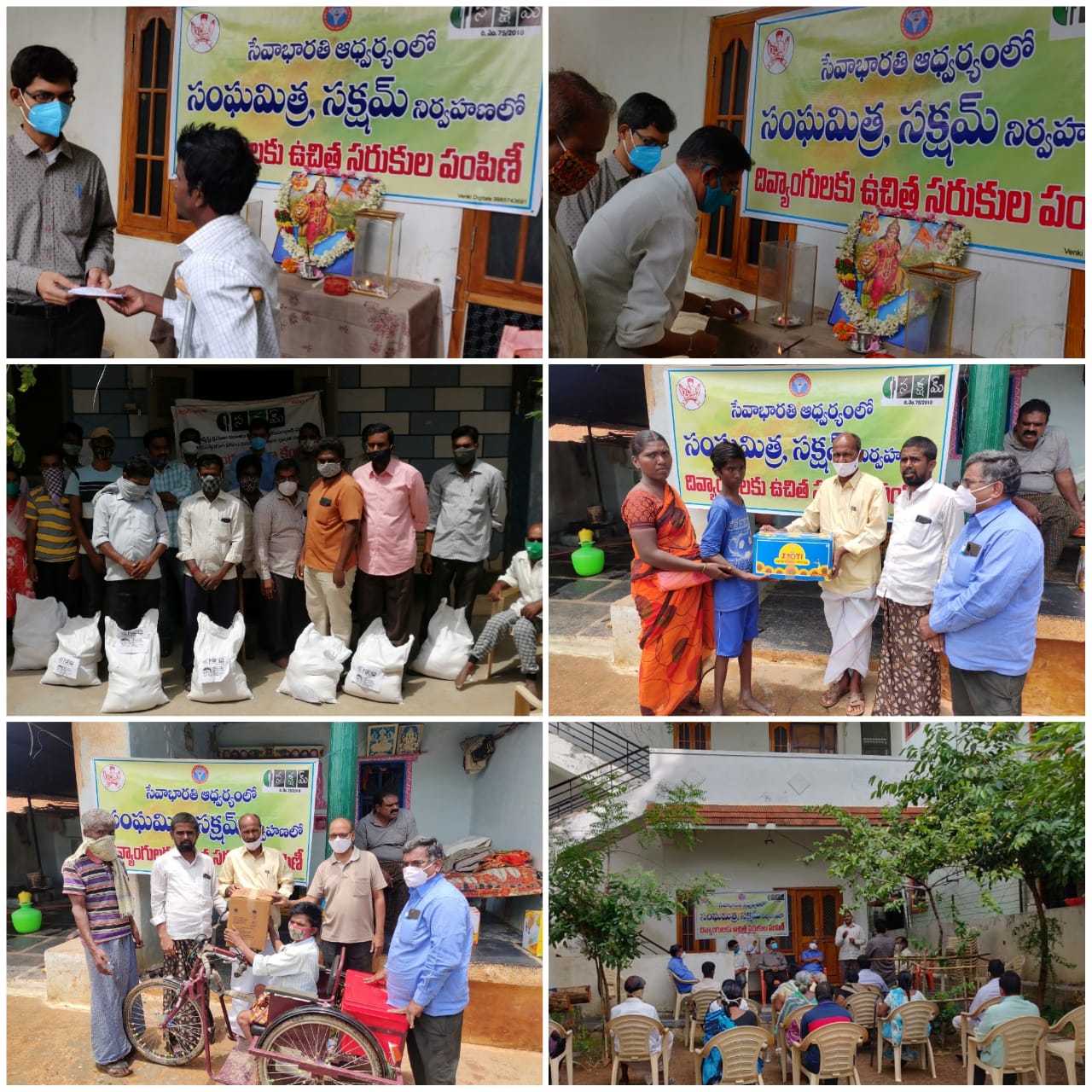 విజయవాడ సమీపంలోని కొటికలపూడి గ్రామంలో దివ్యాంగులు ఉన్న 30 కుటుంబాలకు సక్షమ్ రేషన్ కిట్లు అందజేసింది. ఈ కార్యక్రమంలో ఆరోగ్య భారతి అఖిలభారత అధ్యక్షులు డాక్టర్ మురళీ కృష్ణ, సక్షమ్ ప్రాంత కార్యదర్శి శ్రీ సత్యనారాయణ మూర్తి పాల్గొన్నారు.