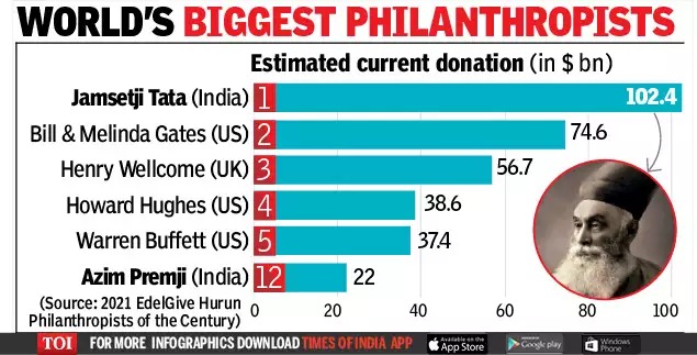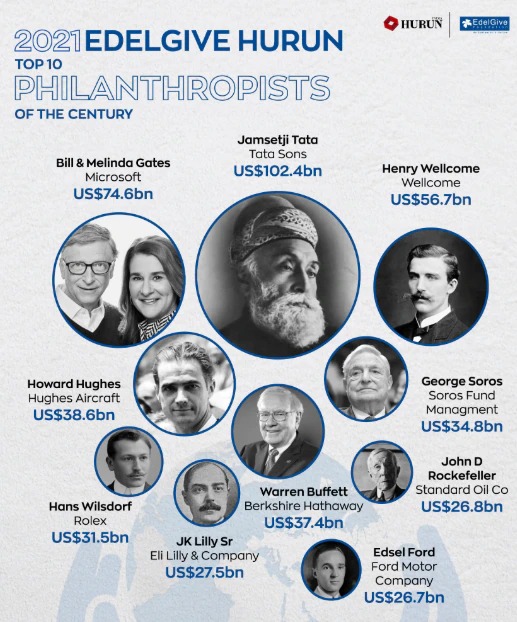 కంపెనీ లాభాల్లో మూడింట రెండు వంతులు విద్య, ఆరోగ్య సంరక్షణతో సహా వివిధ రంగాలకు విరాళాలను కేటాయించడంతో జంషెట్జీ టాటా ముందంజలో నిలిచారు. విప్రోకు చెందిన అజీమ్ ప్రేమ్జీ, తన మొత్తం సంపాదనలో 22 బిలియన్ డాలర్లను సామాజిక కార్యక్రమాలను చేపట్టడానికి విరాళంగా ఇచ్చారు. హురున్ రిపోర్ట్, ఎడెల్గైవ్ ఫౌండేషన్ రూపొందించిన రిపోర్ట్లో టాప్ 50 మందిలో యూఎస్ నుంచి 38 మంది, యూకే నుంచి ఐదుగురు, చైనా నుంచి ముగ్గురు నిలిచారు.