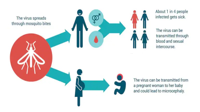 ఈ వైరస్ కలిగిన ఆడ ఎడిస్ దోమ కుట్టడం ద్వారా వ్యాధి సంక్రమిస్తుంది. అంతేకాకుండా లైంగికంగా సంక్రమించే అవకాశం ఉందని భావిస్తున్నారు. గర్భిణులకు ఈ వ్యాధి సోకినట్లయితే పుట్టబోయే పిల్లలకూ వ్యాపించే అవకాశం ఉంటుంది. ఈ పిల్లలు మైక్రోసెఫాలి (తల చిన్నగా ఉండటం) అనే లక్షణంతో ఉంటారు.