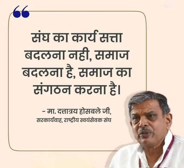 గొప్ప సమాజం కోసం రాష్ట్రీయ స్వయంసేవక్ సంఘం(ఆర్ఎస్ఎస్) పరితపిస్తోందని, సంఘం ఆవిర్భవించినప్పటి నుంచి ఇప్పటి వరకు చేపట్టిన, చేపడుతున్న సేవా కార్యక్రమాలకు సమాజం అమోదముద్ర వేసిందని ఆర్ఎస్ఎస్ సర్కార్యవాహ దత్తాత్రేయ హోసబలే అన్నారు. దేశవ్యాప్తంగా 365 రోజుల పాటు ఒకటిన్నర లక్షలకు పైగా సేవా పనులు నిరంతరం నడుస్తున్నాయని చెప్పారు. హర్యాణాలోని రేవారి జిల్లాలో మూడు రోజుల పర్యటనలో భాగంగా రేవారి గ్రామంలో ఏర్పాటు చేసిన ఉపాధ్యాయుల సమావేశంలో హోసబలే పాల్గొని, మాట్లాడారు.