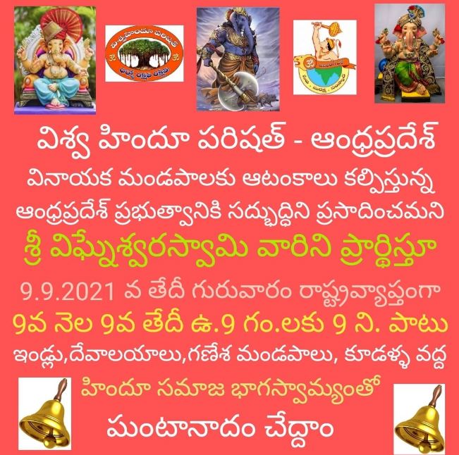 విజయవాడ: ఆంధ్రప్రదేశ్‌ ప్రభుత్వ హిందూ వ్యతిరేక విధానాలకు, హిందువుల పట్ల చూపుతున్న వివక్షతకు, నిర్లక్ష్యానికి నిరసన తెలిపేందుకు, హిందువుల ఐక్యతను, సంఫీుభావాన్ని ప్రకటించేందుకు, ఆటంకాలు కలిగిస్తున్న ప్రభుత్వానికి వినాయకుడు సద్భుద్ధిని ప్రసాదించేందుకు, సంప్రదాయబద్ధంగా వినాయకచవితి జరుపుకునే హక్కును ప్రకటించే నిమిత్తం యావత్‌ హిందూ సమాజం ఘంటానాదం చేయాలని ఏపీ విశ్వహిందూ పరిషత్‌ పిలుపునిచ్చింది. ఈ మేరకు మంగళవారం ఒక కరపత్రం విడుదల చేసింది.
