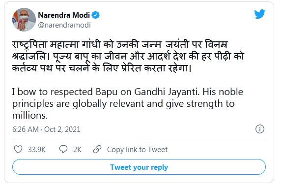 ‘జాతిపిత మహాత్మ గాంధీకి ఆయన జయంతి నాడు ఇదే వినమ్ర శ్రద్ధాంజలి. పూజ్య బాపు జీవనం, ఆదర్శాలు దేశంలో ప్రతి ఒక్క తరం కర్తవ్య పథంలో పయనించడం కోసం ప్రేరణను అందిస్తూ ఉంటాయి. మాననీయ బాపు గారికి గాంధీ జయంతి నాడు నేను ప్రణామాన్ని ఆచరిస్తున్నాను. గొప్పవైన ఆయన సిద్ధాంతాలు యావత్తు ప్రపంచంలో ఉన్నాయి. మరి లక్షల కొద్దీ ప్రజలకు వాటి నుంచి బలం అందుతున్నది’ అని పేర్కొన్నారు.