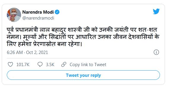 ‘పూర్వ ప్రధాని లాల్ బహాదుర్ శాస్త్రి గారికి ఆయన జయంతి నాడు ఇవే వందనాలు. విలువల పైన, సిద్ధాంతాల పైన ఆధారపడ్డ ఆయన జీవనం దేశప్రజల కు ఎల్లప్పటికి ప్రేరణను అందిస్తూనే ఉంటుంది.’ అని పేర్కొన్నారు.