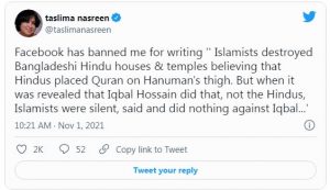 దీంతో ఈ విషయమై ట్విట్టర్ వేదికగా స్పందించారు తస్లీమా. ‘ఇస్లాంకు చెందిన కొందరు హిందువుల ఇళ్ళు, దేవాలయాలపై దాడులకు దిగుతున్నారని నేను పోస్ట్ చేసినందుకే ఫేస్బుక్ నా అకౌంట్ను బ్లాక్ చేసింది. హనుమాన్ కాళ్ల వద్ద ఖురాన్ను ఉంచారన్న కారణంగా ఈ దాడులు జరుగుతున్నాయి. అయితే, ఈ పని చేసింది హిందువులు కాదు.. ఇక్బాల్ హుస్సేయిన్, కానీ ఇస్లాంకు చెందిన వారు మాత్రం ఈ విషయంపై సైలెంట్గా ఉన్నారు. ఇక్బాల్కు వ్యతిరేకంగా ఏం చేయడం లేదు’ అంటూ ట్వీట్ చేశారు. ఇదిలా ఉంటే బంగ్లాదేశ్లో హిందూవులపై దాడులను ప్రస్తావిస్తూ తస్లీమా 1993లో రాసిన ‘లజ్జా’ నవల వివాదాస్పదమైంది. దీంతో అక్కడి ప్రభుత్వం ఆ నవలను నిషేధించింది. 1994లో బంగ్లాదేశ్ను విడిచిపెట్టిన తస్లీమా నస్రీమ్ అప్పటి నుంచి భారత్లోని ఢిల్లీలో నివసిస్తున్నారు.