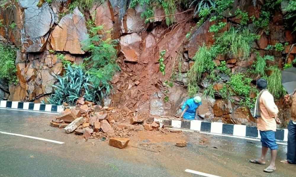 తిరుపతి: కొన్ని రోజులుగా కురుస్తున్న వర్షాలకు తిరుమలలో తాజాగా కొండచరియలు విరిగి మూడు చోట్ల రోడ్డు పూర్తిగా ధ్వంసమైంది. దీంతో భక్తులు భయాందోళనకు గురవుతున్నారు. రెండో కనుమ దారి లింక్ రోడ్డుకు సమీపంలోని రహదారిపై.. పెద్ద బండరాళ్లు అడ్డంగా పడిపోయాయి. ఘటన సమయంలో వాహన రాకపోకలు లేకపోవడంతో ప్రమాదం తప్పింది. రోడ్డుపై అడ్డంగా రాళ్లు పడటం వల్ల ట్రాఫిక్ స్తంభించిపోయింది. అధికారులు రాళ్లను తొలిగిస్తున్నారం. బండరాళ్లు పడటంతో రహదారి ధ్వంసమైంది.
