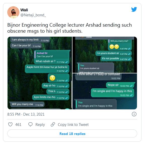 చాటింగ్కు సంబంధించి మొహమ్మద్ అర్షద్ను ఓ విద్యార్థిని మీరు నా ఉపాధ్యాయుడు.. మీరు మీ లిమిట్స్ లో ఉంటే బాగుంటుంది అని అడిగింది. అందుకు అతడు సమాధానం ఇస్తూ.. నీ ప్రియుడుగా ఉండనివ్వు అంటూ విద్యార్థినికి ఆఫర్ ఇచ్చాడు. విద్యార్థినికి ఇలాంటి అనుచితమైన ప్రతిపాదన పెట్టడానికి అతనికి ఎంత ధైర్యం అని అమ్మాయి ప్రశ్నించింది. దానికి బదులుగా అర్షద్ ఆమెను పెళ్లి చేసుకుంటానని ప్రతిపాదించాడు. కావాలంటే పెళ్లి చేసుకోడానికి రాజీనామా చేస్తానని అర్షద్ ఆమెకు చెప్పాడు.