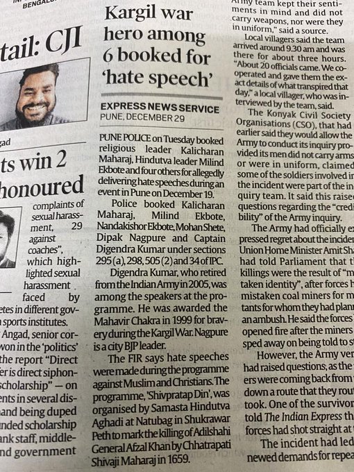 ముంబై: కార్గిల్ యుద్ధ వీరుడు దిగేంద్ర కుమార్తో పాటు మరో ఐదుగురిపై ‘ద్వేషపూరిత ప్రసంగం’ కింద కేసు నమోదు అయింది. దీంతో ‘సెక్యులర్’ ఉద్ధవ్ థాకరే ప్రభుత్వం మరో మరక అంటించుకున్నట్టయింది. అఫ్జల్ ఖాన్పై ఛత్రపతి శివాజీ మహారాజ్ సాధించిన విజయాన్ని పురస్కరించుకుని కిందటి నెల 19న జరిగిన శివప్రతాప్ దిన్ సందర్భంగా మతపరమైన ఆరోపణతో కూడిన ప్రసంగాలకు పూణే పోలీసులు 28న సుమోటోగా కేసు నమోదు చేశారు.