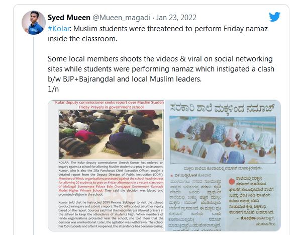 కర్ణాటక: కర్ణాటక, ముల్బాగల్లోని సోమేశ్వర పాలయ బాలే చంగప్ప ప్రభుత్వ కన్నడ మోడల్ స్కూల్లోని ముస్లిం విద్యార్థులు తరగతి గదిలో నమాజ్ చేశారు. ఈ దృశ్యాలు సోషల్ మీడియాలో వైరల్ కావడంతో, ఇతర విద్యార్థుల తల్లిదండ్రులు, పాఠశాల పూర్వ విద్యార్థులు, హిందూ సంఘాలు నిరసనకు దిగాయి.