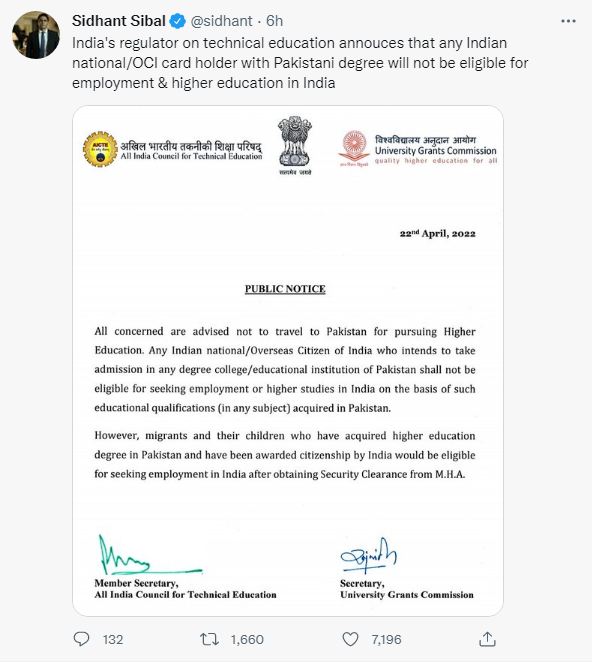 పాకిస్తాన్కు వలస వెళ్ళిన వారు, వారి పిల్లలు భారత పౌరసత్వం కలిగి ఉన్నవారి డిగ్రీలు.. కేంద్ర హోం శాఖ భద్రతాపరమైన అనుమతితో పరిగణిస్తామని సంస్థలు తేల్చి చెప్పాయి. ఈ మేరకు యూనివర్సిటీ గ్రాంట్స్ కమిషన్, ఆల్ ఇండియా కౌన్సిల్ ఫర్ టెక్నికల్ ఎడ్యుకేషన్ సంయుక్త ప్రకటనను విడుదల చేశాయి. పాకిస్తాన్లో చదివే భారతీయ విద్యార్థుల సంఖ్య తక్కువే ఉంటున్నప్పటికీ భద్రతా కారణాల దృష్ట్యా యూజీసీ, ఐఏసీటీఈ ఈ నిర్ణయం తీసుకున్నట్టు తెలుస్తోంది.