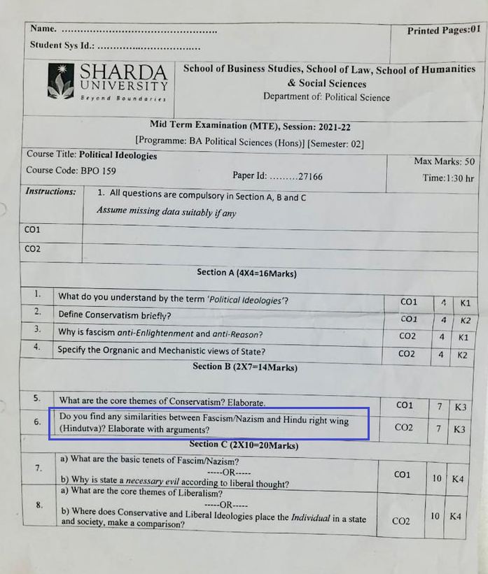 ఉత్తరప్రదేశ్‌: ఫాసిజం/నాజీయిజం, హిందుత్వ మధ్య సారూప్యతలను రాయమని శారదా విశ్వవిద్యాలయం విద్యార్థులను కోరింది. ఉదాహరణల ద్వారా సారూప్యతలను రాయాల‌ని కోరింది.ఈ ప్రశ్నపత్రం స్క్రీన్‌షాట్ సోషల్ మీడియా ప్లాట్‌ఫారమ్‌లలో రావడంతో వివాదం చెలరేగింది.