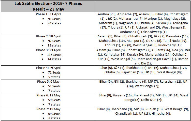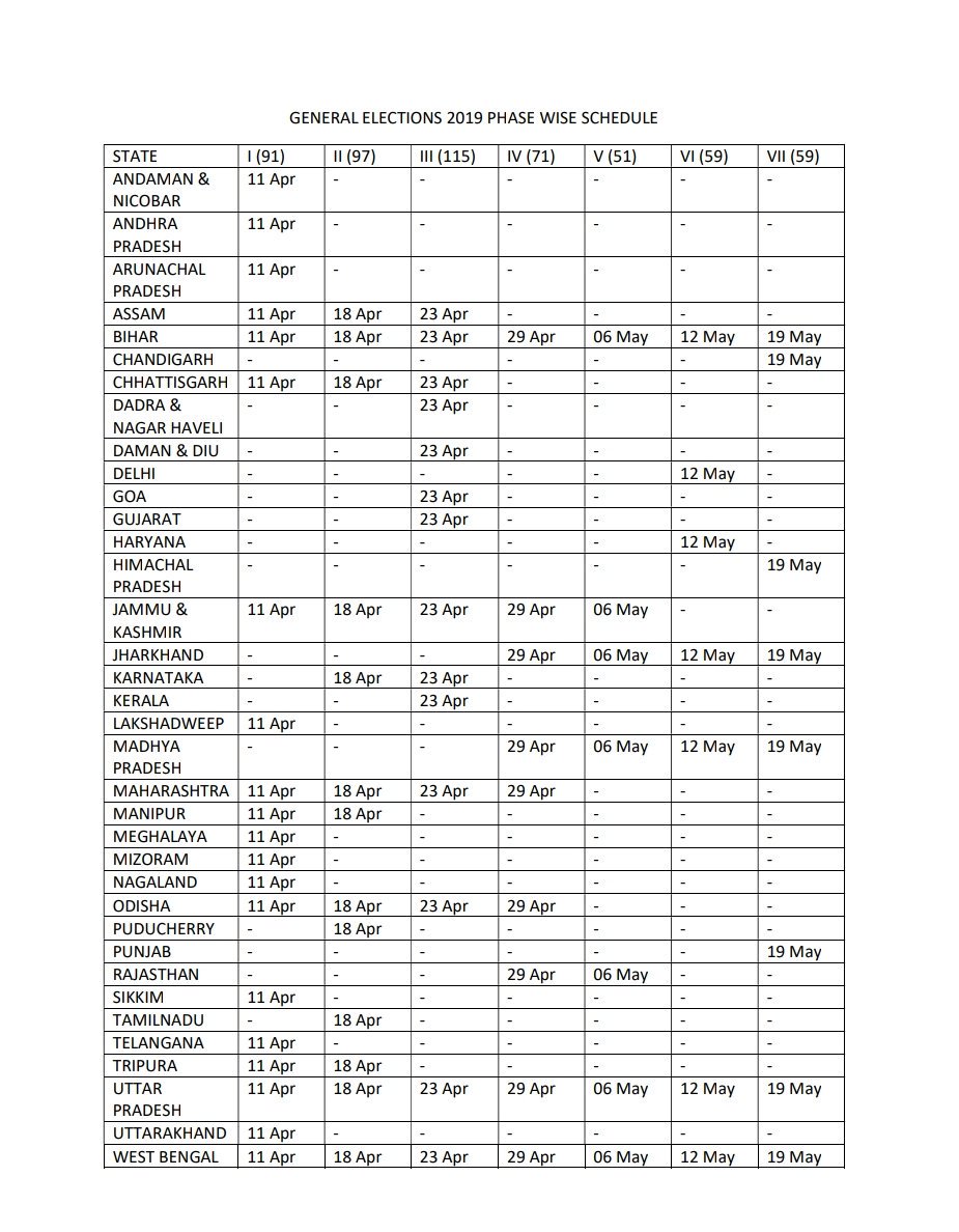 సార్వత్రిక ఎన్నికల షెడ్యూల్ ను కేంద్ర ఎన్నికల సంఘం విడుదల చేసింది. వివిధ రాష్ట్రాల నియోజకవర్గాల సంఖ్య, రాష్ట్రాల్లోని పరిస్థితులను బట్టి ఏడు దశల్లో ఎన్నికలు జరగనున్నాయి. ఏయే రాష్ట్రాల్లో ఏయే దశలో ఎన్ని నియోజకవర్గాలకు పోలింగ్ జరుగుతుందంటే