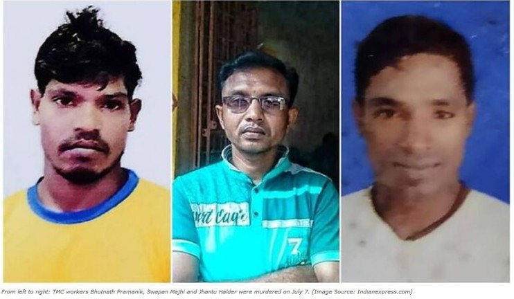 కోల్కతా: పశ్చిమ బెంగాల్లో మరో దారుణం సంభవించింది. ముగ్గురు హిందూ టీఎంసీ కార్యకర్తలను ముస్లిం టీఎంసీ కార్యకర్తలు హత్య చేశారు. గోపాల్పూర్ గ్రామ పంచాయతీ సభ్యుడు స్వపన్ మాఝీతో సహా మరో ఇద్దరు హిందూ టీఎంసీ కార్యకర్తలు హత్యకు గురయ్యారు. దక్షిణ 24 పరగణాస్ జిల్లాలోని కానింగ్లోని పీర్ పార్క్ సమీపంలో జూలై 7, గురువారం ఈ సంఘటన జరిగింది. నివేదికల ప్రకారం, ఆరుగురు బృందంగా మారి, హత్య చేశారు. మాఝీతోపాటు జంతు హల్దర్, భూత్నాథ్ ప్రమాణిక్ బలితీసుకున్నారు.