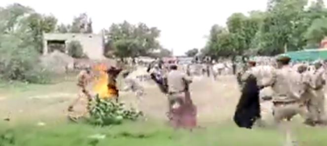 Watch। #Rajasthan: A saint named Baba Vijay Das chanting #RadheRadhe set himself on fire to protest the illegal mining in Pasopa village of Bharatpur, Rajasthan.