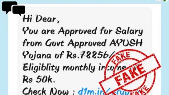 కేంద్ర ప్రభుత్వం ఆమోదించిన ఆయుష్‌ యోజన కింద అర్హులైన వ్యక్తులకు నెలవారీగా ఆకర్షణీయమైన శాలరీ వస్తుందని, ఇందుకోసం కింద పేర్కొన్న లింక్‌పై క్లిక్‌ చేయాలంటూ వస్తోన్న సందేశంపై కేంద్ర ప్రభుత్వం అప్రమత్తమైంది. కేంద్ర ప్రభుత్వం ఆమోదించిన ఆయుష్‌ యోజన కింద రూ.78,856ల శాలరీకి మీరు ఎంపికయ్యారు. ఈ లింక్ ‌పై క్లిక్‌ చేస్తే నెలకు రూ.50వేలు చొప్పున ఆదాయం పొందొచ్చంటూ ఉన్న స్క్రీన్‌ షాట్ ‌ని కేంద్ర సమాచార ప్రసార శాఖ (పీఐబీ) ఫ్యాక్ట్ ‌చెక్‌ వెబ్‌సైట్‌లో పోస్ట్‌ చేసింది. ఇది పూర్తిగా నకిలీ సందేశమని, ఇలాంటివాటి పట్ల ప్రజలు అప్రమత్తంగా ఉండాలని విజ్ఞప్తి చేసింది. అలాంటి పథకమేదీ కేంద్ర ప్రభుత్వం అమలుచేయడంలేదని స్పష్టం చేసింది.