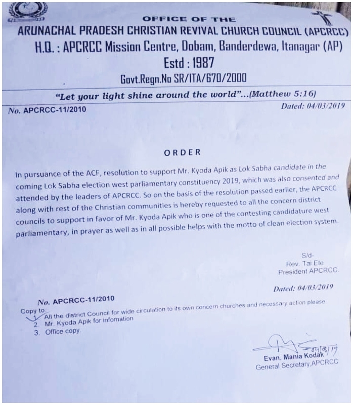 The LRO is therefore requesting the Election Commission of India to take stringent action against aforesaid Church which has appealed Christian voters to vote Kyoda Apik who is a candidate from Arunachal West Lok Sabha constituency.