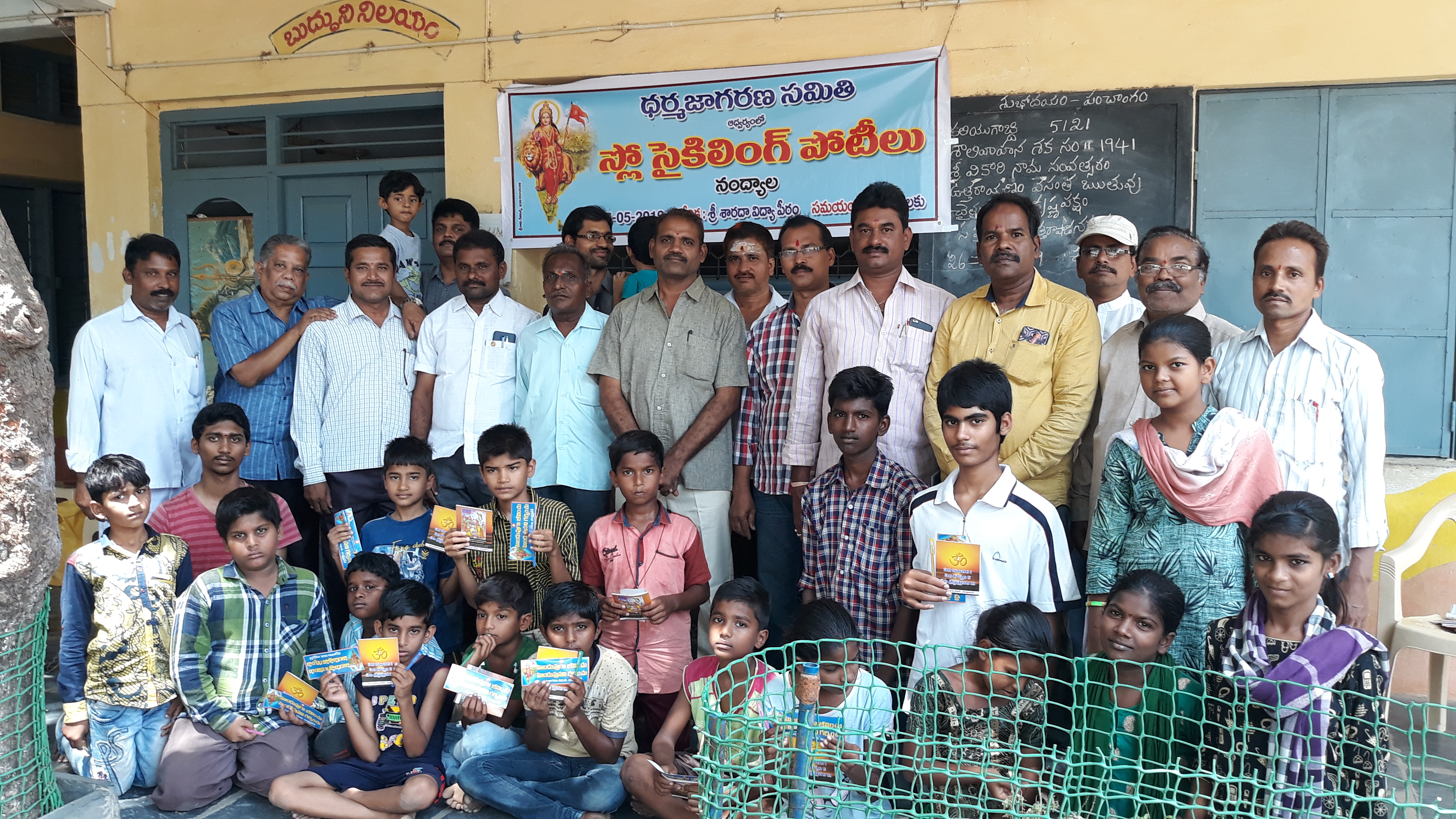 ధర్మజాగరణ సమితి నంద్యాల ఆధ్వర్యంలో శ్రీ శారదా విద్యా పీఠం ఇంగ్లీష్ మీడియం హైస్కూల్ ఫారూఖ్ నగర్ లో స్లో సైక్లింగ్ పోటీలు జరిగాయి. ఈ పోటీలను శ్రీ సముద్రాల ఆంజనేయులు గారు భారతమాతకు మాలార్పణ గావించి ప్రారంభించారు.ఈ ప్రారంభ కార్యక్రమంలో శ్రీ వై.రాంప్రసాద్ గారు మాట్లాడుతూ ఇలాంటి పోటీలు విద్యార్థులలో గెలుపు ఓటములు సమానంగా తీసుకునే మానసిక స్థితిని కలిగించి ఆత్మహత్యకు పాల్పడకుండా చేస్తాయని తెలిపారు.  శ్రీ నాగరాజుగారు మాట్లాడుతూ, పోటీలు నియమానుసారంగా ఆడటంవలన ప్రతి విషయంలో నియమపాలన అలవడుతుందని పేర్కొన్నారు. శ్రీ చింతల పల్లె వాసు గారు మాట్లాడుతూ, శారీరక వికాసం కొరకు ఈ ఆటల పోటీలు జరుగుతున్నాయని ,ఆద్యాత్మిక వికాసానికి ఈనెల 12వతేది ఆదివారం ఉదయం 9-30గంటలకు శ్రీ భద్రావతి భావనాఋషి దేవాలయం, నంద్యాల నందు భజన పోటీలు జరుగునని తెలిపారు. స్లో సైక్లింగ్  పోటీలలో 50మంది విద్యార్థులు ఉత్సాహంగా పాల్గొని విజయవంతంచేశారు.ఈ పోటీలలో అమ్మాయిలు కూడా పాల్గొన్నారు.  ఇలాగే భజన పోటీల్లో పాల్గొని విజయవంతం చేయవలసిందిగా నిర్వాహకులు  కోరారు.ముగింపు కార్యక్రమంలో వై.ఎన్. విషువర్ధన్ రెడ్డి ,మనోహర్ జీ ,డా,కె.ఉదయ్ శంకర్ ,డా,శిల్పా మహేశ్వరరెడ్డి  , సత్యనారాయణ, అన్నెం శ్రీనివాసరెడ్డి,దండు వెంకటేశ్వర్లు,కె.మనోహర్ నాయుడు ,D.V సుబ్బయ్య తదితరులు పాల్గొన్నారు.