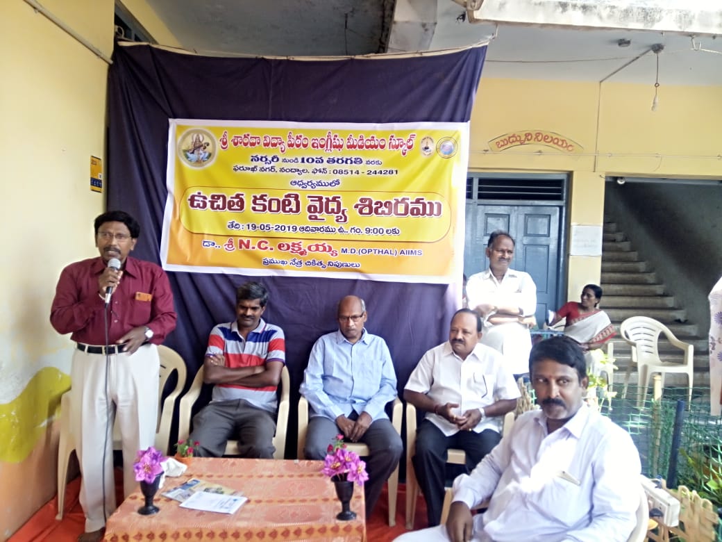 శ్రీ శారదా విద్యా పీఠం ఇంగ్లీష్ మీడియం హైస్కూల్, ఫారూఖ్ నగర్, నంద్యాల ఆధ్వర్యంలో డా||N.C. లక్ష్మయ్య ప్రముఖ కంటి వైద్య నిపుణులు గారిచే ఉచిత నేత్ర వైద్య శిబిరం నిర్వహించడం జరిగినది. ఈ కార్యక్రమంలో రిటైర్డ్ మెడికల్ ఆఫీసర్ శ్రీ దామోదర్, ల్యాబ్ టెక్నీషియన్ శ్రీ శశి కుమార్, రోగులకు బిపి మరియు షుగర్ పరీక్షలు నిర్వహించారు. ప్రారంభకార్యక్రమంలో డా|| గెలివి సహాదేవుడు, శ్రీ వై.రాంప్రసాద్, శ్రీ గోళ్ళ సుదర్శనం, శ్రీ మూటాల నాగరాజు, శ్రీ మురళి కృష్ణ పాల్గొన్నారు. డా||లక్ష్మయ్య కంటికి సంబంధించి తీసుకోవలసిన జాగ్రత్తలు గురించి వివరించారు. ఈ వైద్య శిబిరంలో 125 మందికి పరీక్షలు నిర్వహించారు. అవసరమైన వారికి ఉచితంగా ఆపరేషన్ నిర్వహించి కంటి అద్దాలు కూడా ఇస్తామని డా||లక్షయ్య తెలిపారు.