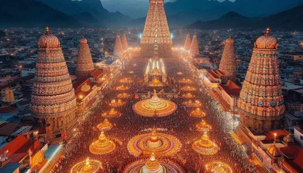 తమిళనాడులోని తిరువణ్ణామలైలో కార్తీకమాస దీపోత్సవాలు అంగరంగ వైభవంగా జరుగుతున్నాయి. ఆదివారం కార్తీక పౌర్ణమి సందర్భంగా అరుణాచల గిరులు విద్యుత్ దీపాలంకరణలతో దేదీప్యమానంగా ప్రకాశించాయి. భక్తులు కాల్చిన బాణాసంచా వెలుగులతో, అరుణాచలం ఆలయ ప్రాకారం, అరుణగిరి ఆథ్యాత్మికతో వెల్లివిరిసాయి. రకరకాల పూలతో అందంగా అలంకరించిన వాహనాలపై అన్నామలైయార్, నిమ్ములై అమ్మన్లను మాడ వీధుల్లో ఊరేగుతూ భక్తులను అనుగ్రహిస్తున్నారు. ఈ నేపధ్యంలోనే పంజరథ రథోత్సవం అంగరంగ వైభవంగా జరిగింది. భక్తుల శివనామస్మరణతో అరుణగిరి మార్మోగింది. వేలాదిమంది భక్తులు గిరి ప్రదక్షిణ చేశారు.