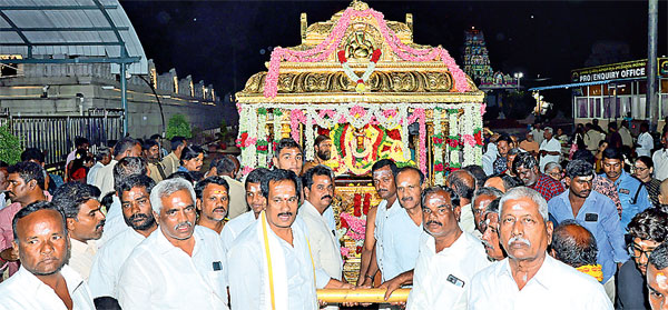 చిత్తూరు జిల్లా కాణిపాక శ్రీ వరసిద్ధి వినాయకస్వామి సిద్ధిబుద్ధి సమేతుడై స్వర్ణరథంపై ఆలయ మాడ వీధుల్లో ఊరేగుతూ గురువారం రాత్రి భక్తులను కటాక్షించారు. స్వామివారి ఉత్సవమూర్తులకు ఆలయ అలంకార మండప వేదిక వద్ద ప్రత్యేక పూజలు నిర్వహించి, స్వర్ణ రథంపై అధిష్ఠించి గణేశ నామస్మరణల నడుమ ఊరేగించారు. పాలకమండలి ఛైర్మన్ ఎ.మోహన్రెడ్డి, కాణిపాకం సర్పంచి కె.శాంతిసాగర్రెడ్డి, మాజీ సర్పంచి కె.మధుసూధన్రావు, ఆలయ ఏఈవో విద్యాసాగర్రెడ్డి, ఉభయ దారులు, భక్తులు పాల్గొన్నారు.
